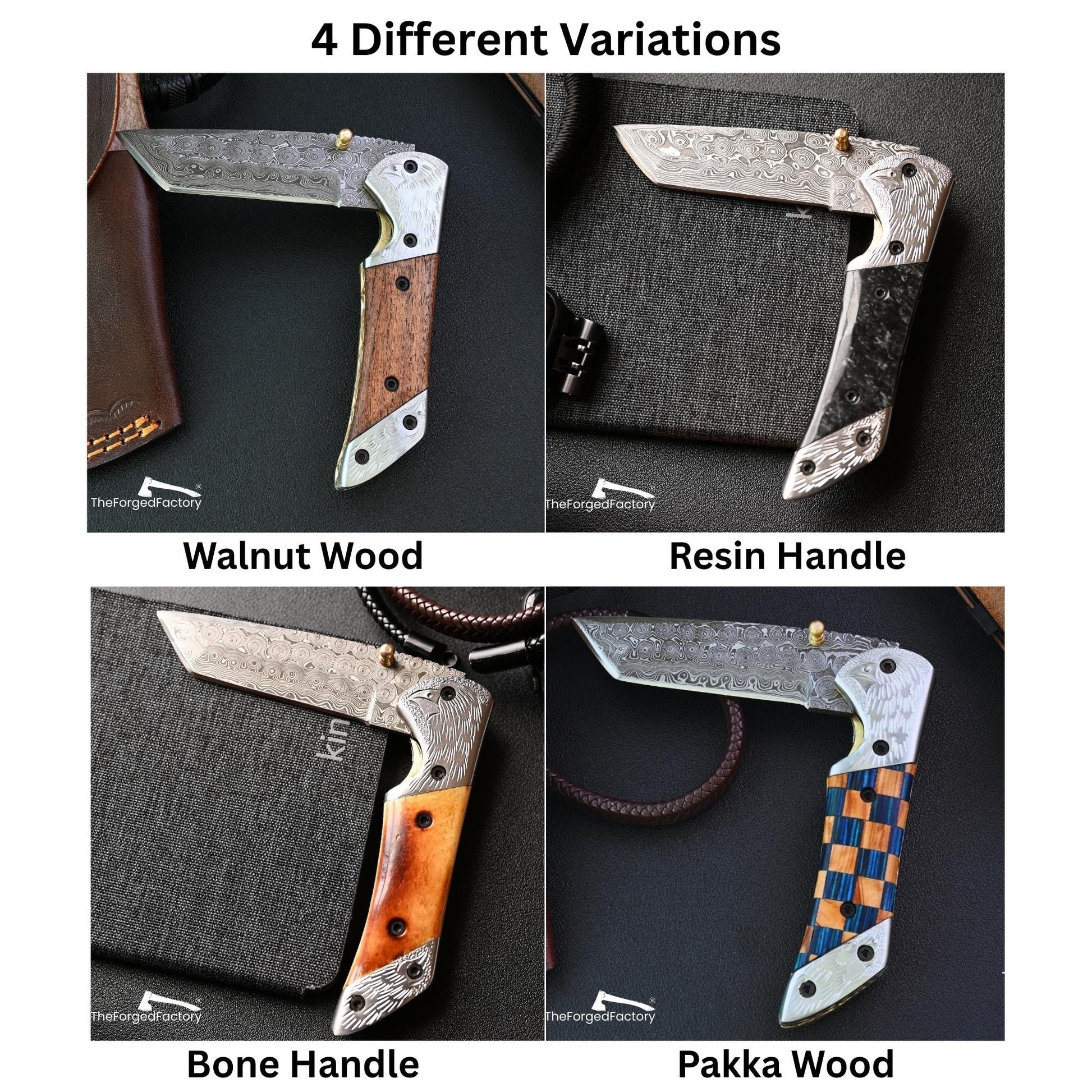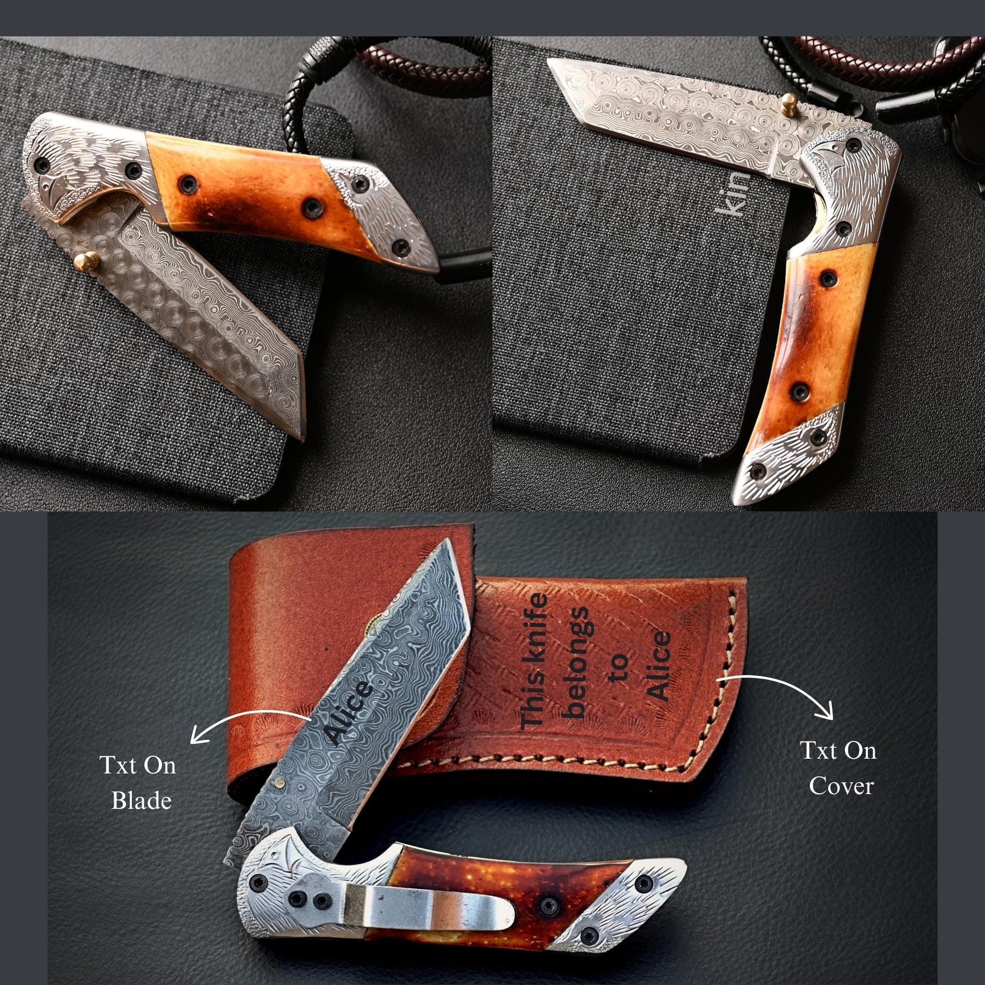 Hand-forged Damascus steel foldable pocket knife with camel bone handle & leather sheath, Perfect personalized gift for men, anniversaries & Father’s Day.