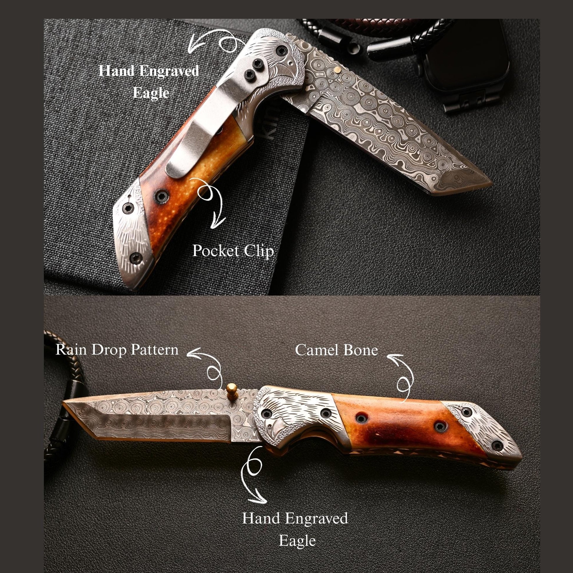 Handle Material: steel hand engraved bolster with camel Bone