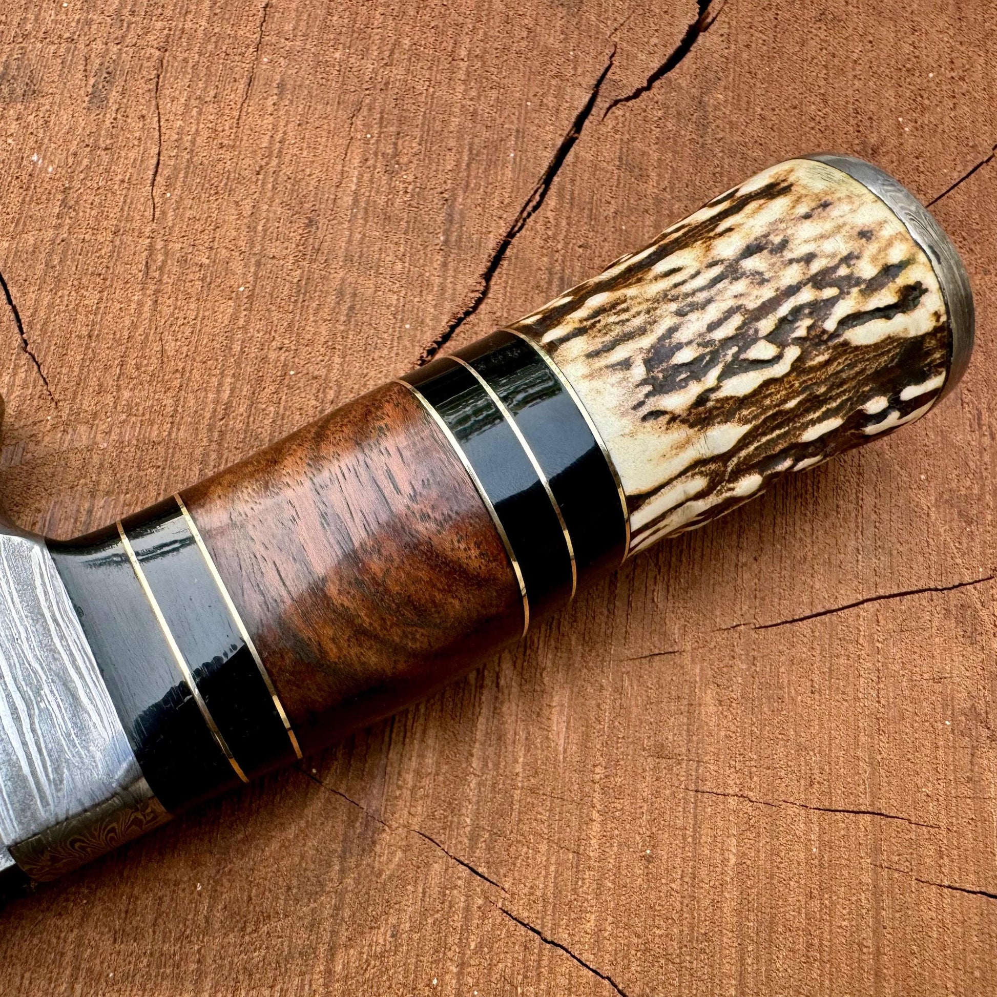 Experience the perfect blend of artistry and functionality with this hand-forged Damascus steel hunting knife. Every inch of this knife reflects precision, craftsmanship, and tradition — from the mesmerizing Damascus pattern to the natural stag antler and exotic wood handle. Designed for collectors, and knife enthusiasts who value true handmade quality.