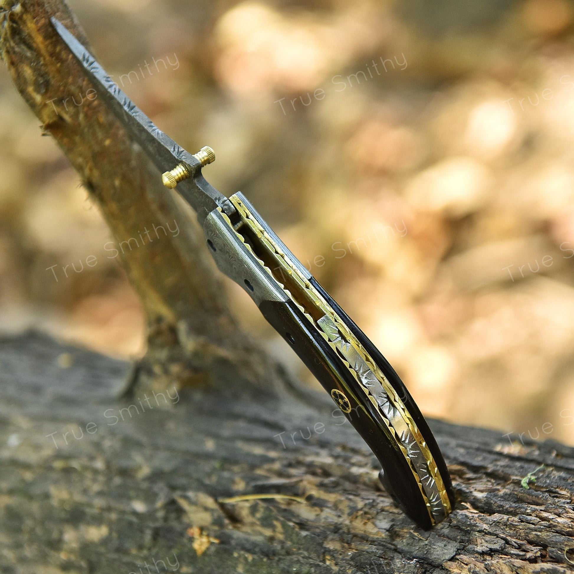 Damascus Steel Folding Pocket Knife – Buffalo Horn Handle, Personalized